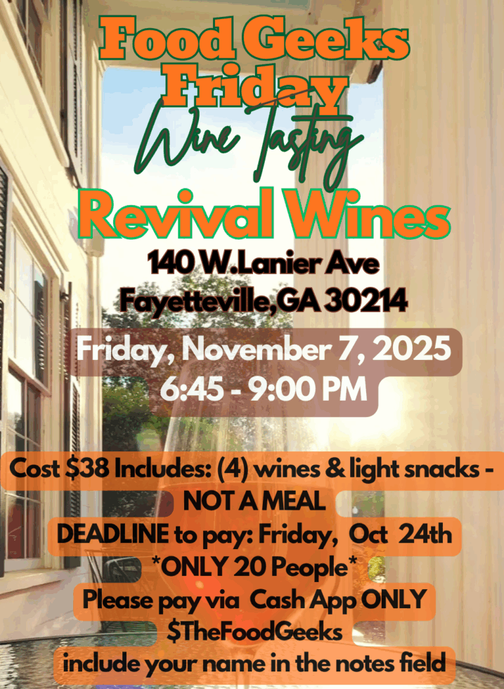 Revival Wines 140 W. Lanier Ave, FayettevilleJoin us for a Food Geeks Friday wine tasting. [...]